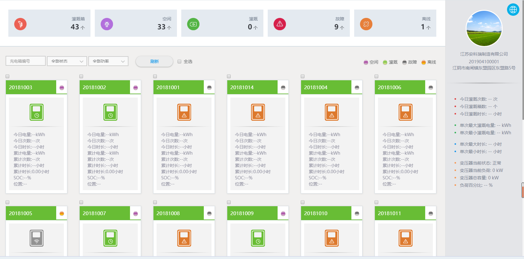 包含灌溉管理站地址,可以看到设备状态的统计,今日开户,充值金额,灌溉金额,灌溉电量,灌溉次数,灌溉时长的统计。