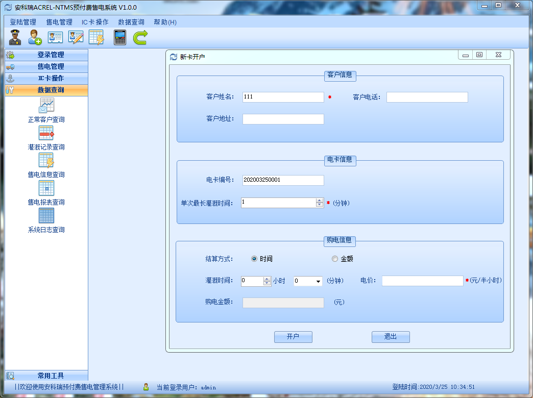 该界面包含了客户新卡开户需要填写的信息,主要包含客户基本信息,电卡信息的填写,和购电结算方式的选择和灌溉时间的输入,电价和金额的填写。