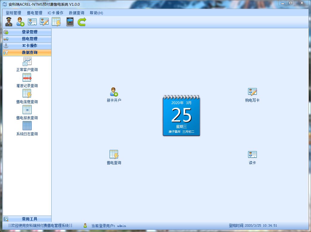 显示了主要功能:新卡开户,购电写卡,售电查询,读卡。