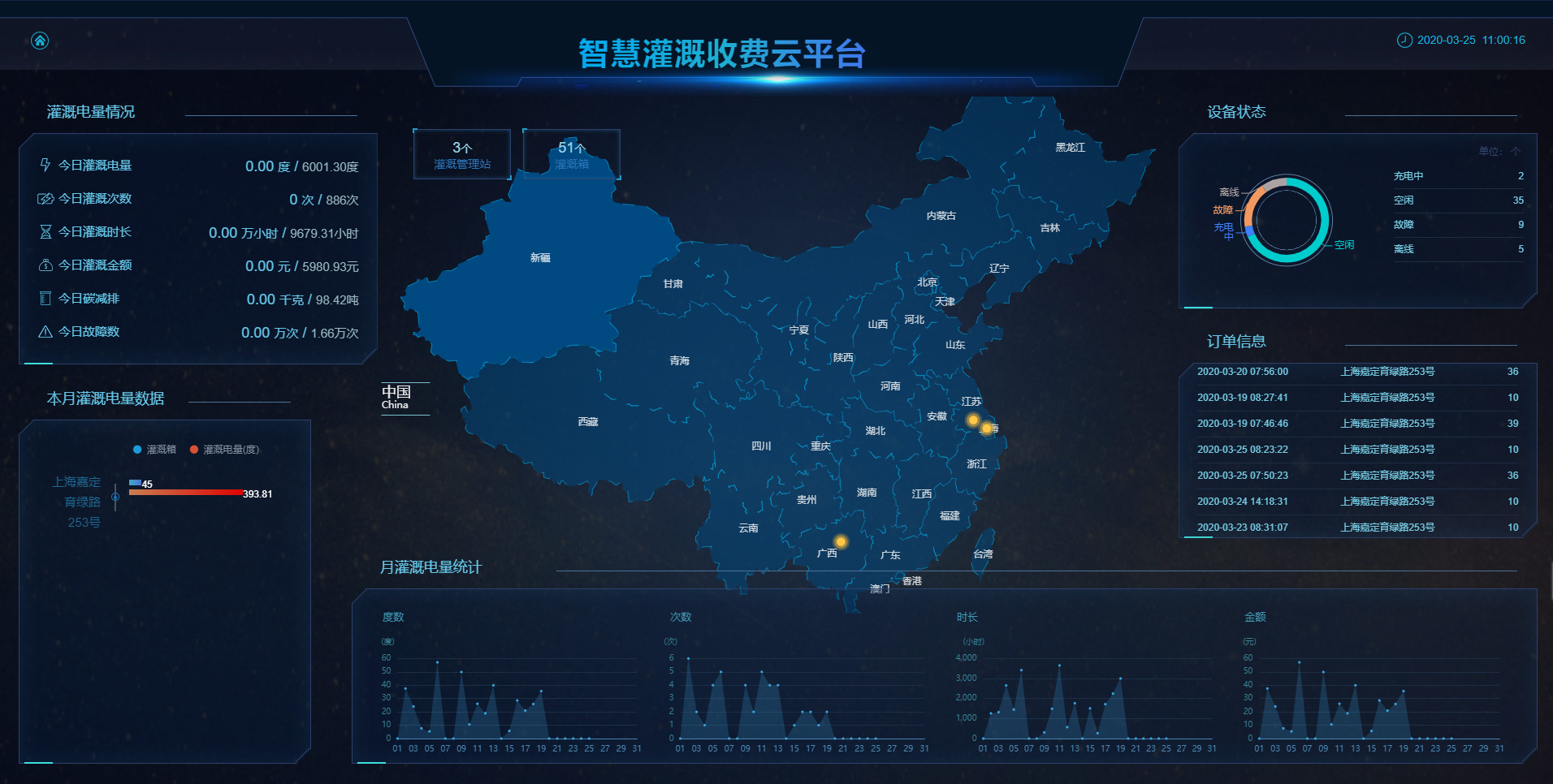 该页面显示了灌溉管理站在地图中的所在区域,所有设备状态,今日灌溉电量情况,当月灌溉电量数据,月灌溉电量的度数、次数、时长、金额的统计图。