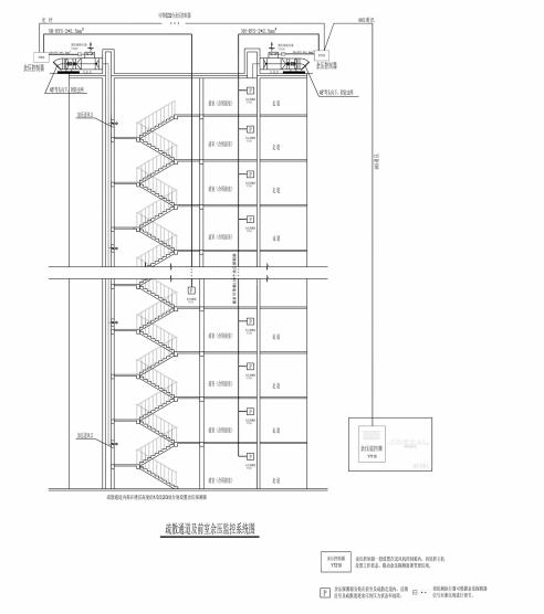 ⑦楼梯间及合用前室均采用加压送风的防烟方式,正压送风每层设置一个送风口,风口采用远控多叶送风口,送风口平时关闭;当发生火灾余压差有变化时,余压控制器接收到余压探测器的信息,调节泄压阀控制余压在合理范围内。