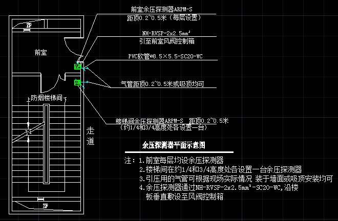 ③余压控制器与余压探测器之间为二总线通讯,通讯距离500m,线型NH-RVSP2*2.5mm2;