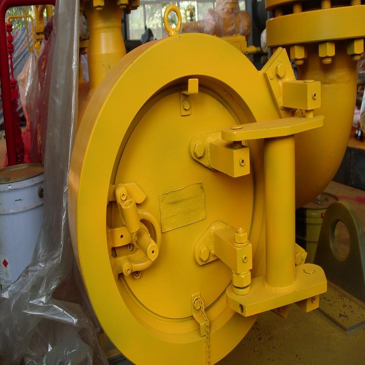 安全在当今工业中至关重要,快开盲板不仅能快速操作且利于整体安全以避免不安全操作。处于锁紧位置时,内部压力使盲板门与筒节间的锁紧部件锁紧以保证门无法开启。压力报警阀的应用使安全性更为加强。
