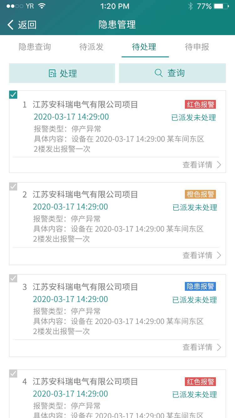 隐患管理功能包括了隐患查询、隐患派发、隐患处理和隐患分析四个模块。可以查看登录用户下的所有项目的隐患信息,并进行派发和处理操作,且对所有隐患进行统计分析。