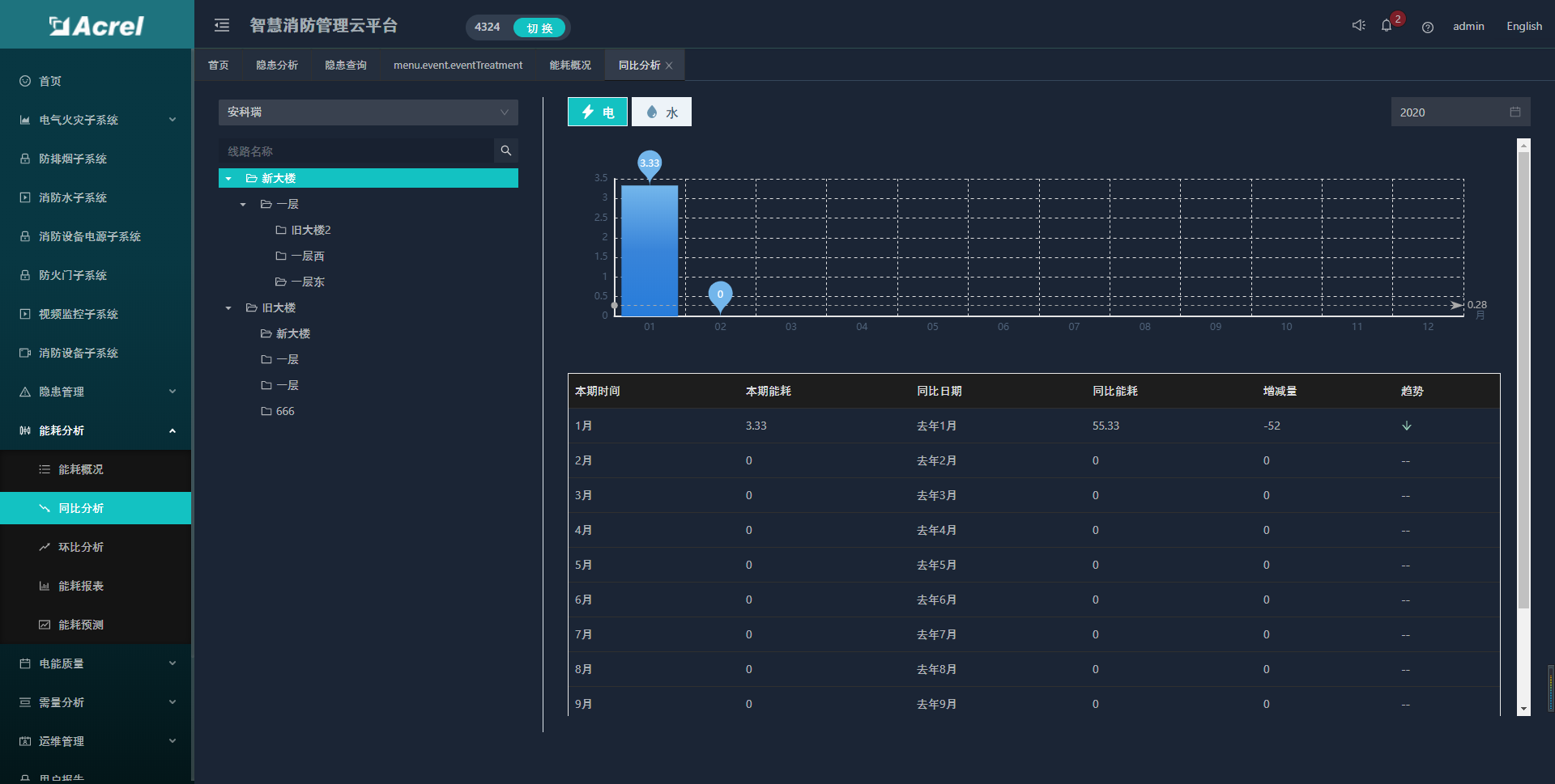 能耗分析功能包括了能耗概况、能耗同比、能耗环比、能耗报表和能耗预测等五个模块。可以查看登录用户下的所有项目的能耗统计、同环比和报表,且按日、周、月等维度进行能耗预测分析。