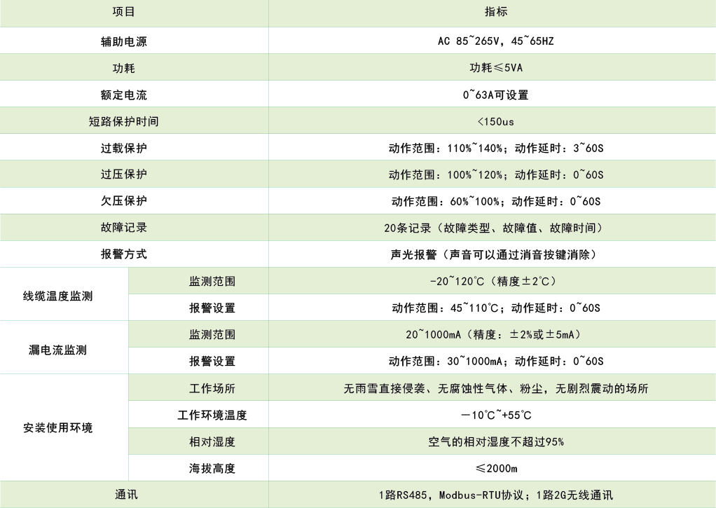 6) 漏电流监测:当被监测的线路漏电超过报警设定值时,保护器发出声光报警信号,可预先设置是否启动限流保护。