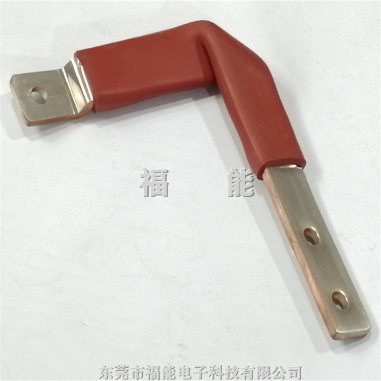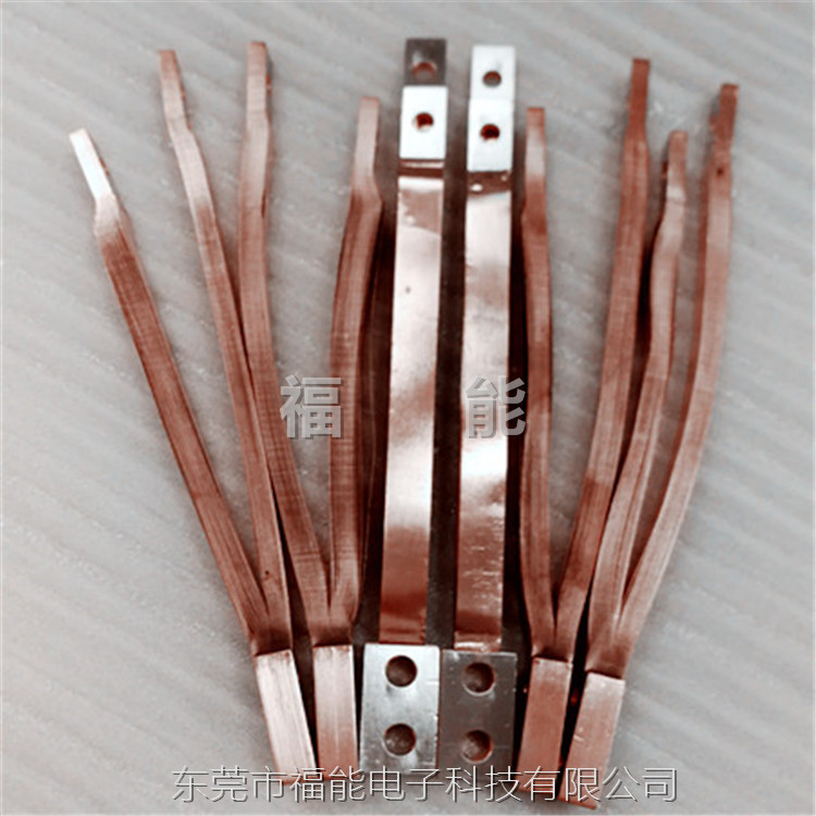 制作工艺:将铜箔叠片部分压在一起,上下表面贴0.1厚纯镍片,或0.1厚镀镍铜片,两端或者打孔部分采用高分子扩散焊,通过大电流加热压焊成型,中间套热缩管保护,大尺寸异形产品,中间采用浸塑工艺。