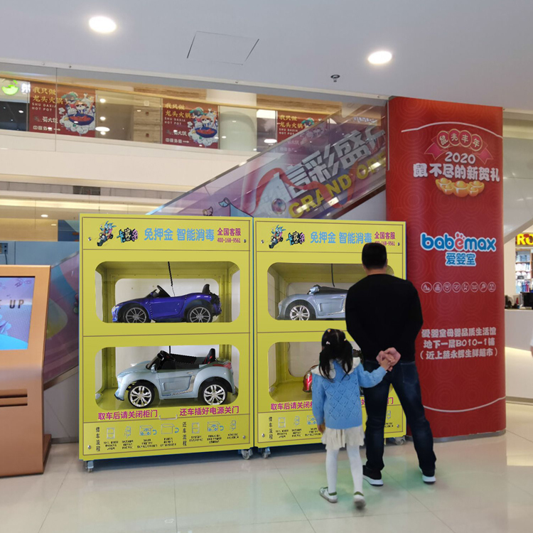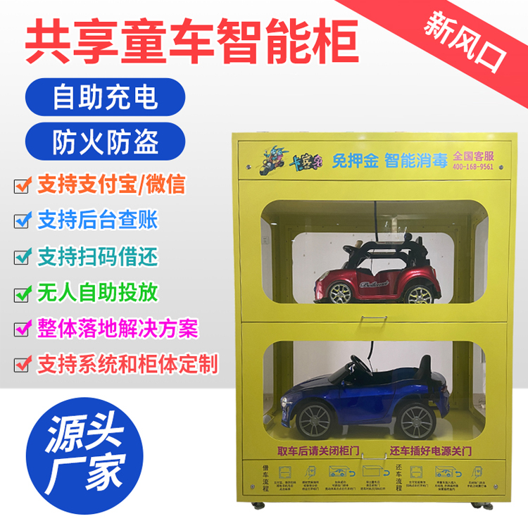 共享童车柜是目前市场较为火爆的娱乐产品之一,2021年初期开始火爆上市,适合投放于商场、大型娱乐中心、休闲广场、公园、步行街及大型社区,目前还属于蓝海市场,投入小回报快,无需人工值守,智能扫码支付,自助取车还车,具备紫外线消毒功能。