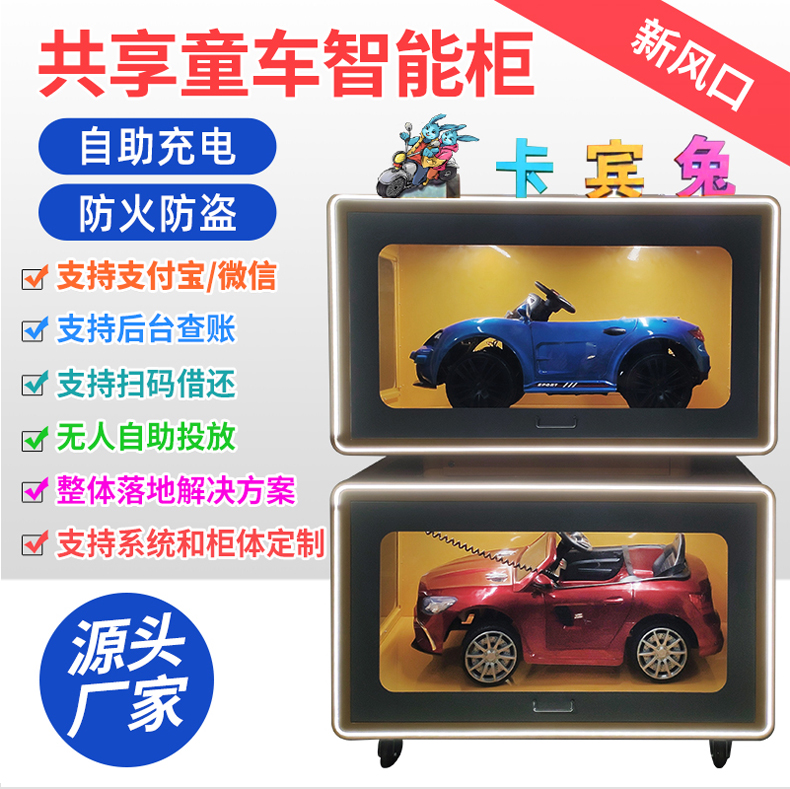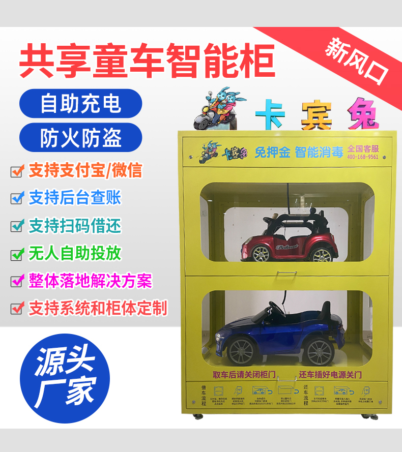 共享童车柜是目前市场较为火爆的娱乐产品之一,2021年初期开始火爆上市,适合投放于商场、大型娱乐中心、休闲广场、公园、步行街及大型社区,目前还属于蓝海市场,投入小回报快,无需人工值守,智能扫码支付,自助取车还车,具备紫外线消毒功能。