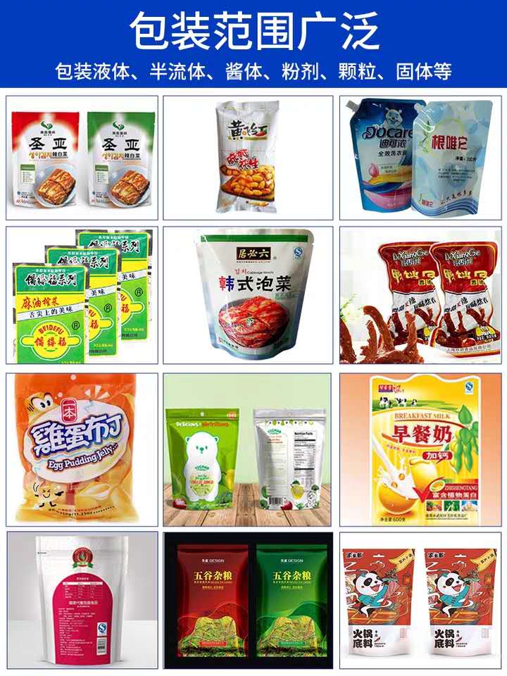 4、包装袋适用范围广泛,本机对于多层复合膜、单层PE、PP等制成的预制袋、纸袋均可应用。