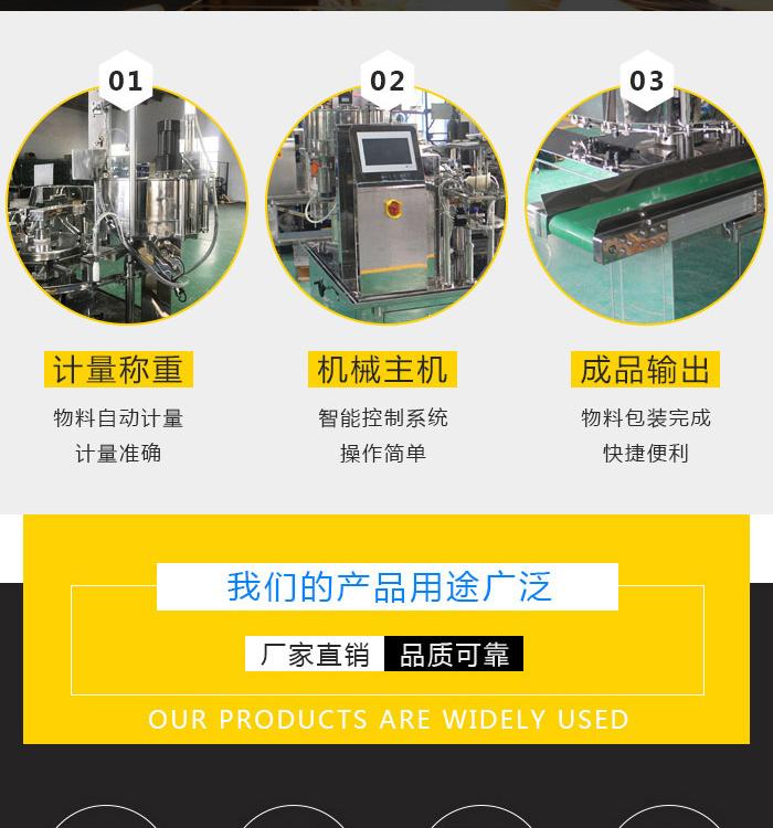 5、机器的包装范围广泛。根据包装物料不同选择不同填充装置,就可实现对固体物料、液体、酱体、粉剂、颗粒等各种物料的包装。