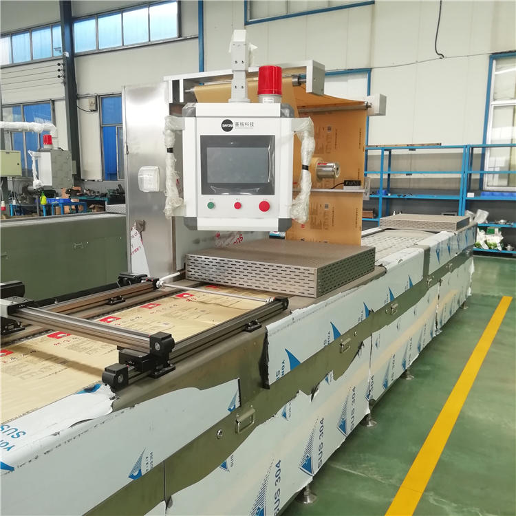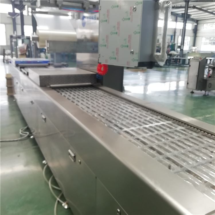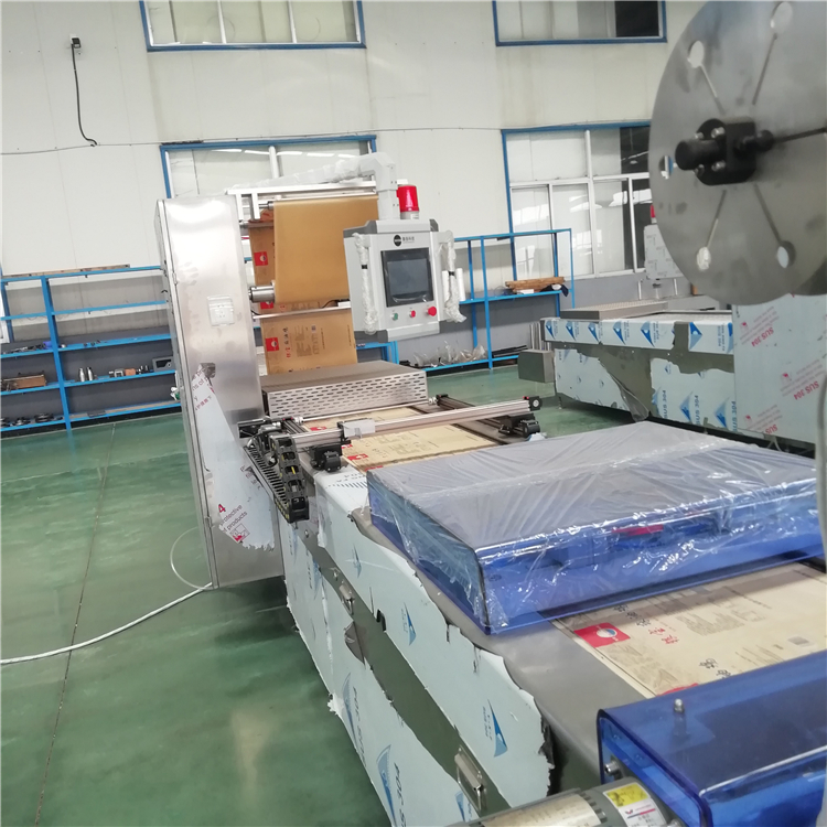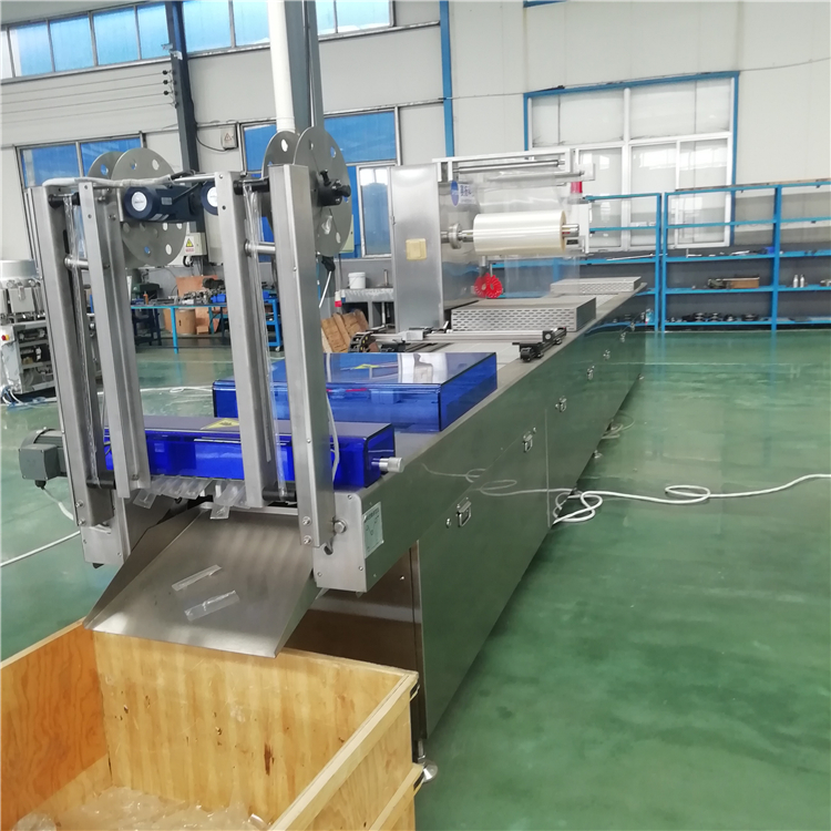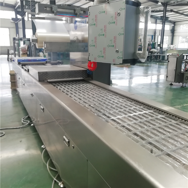 拉伸膜包装机即全自动拉伸膜真空包装机又称全自动塑料盒热成型真空包装机。这类包装机卫生、节省人工,而且包装成本较低,已成为食品包装的潮流。这种膜配以热成形包装机,不但可包装固体、液体、软物体、易碎品等,还可进行真空软膜包装、硬膜充气包装、泡罩包装等。