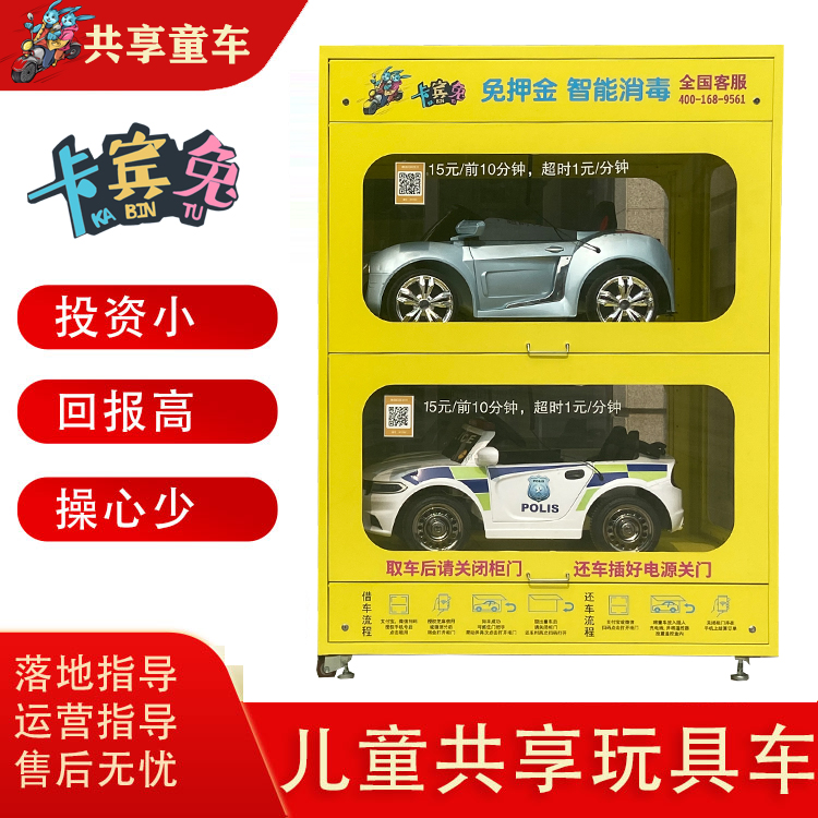 共享童车柜是目前市场较为火爆的娱乐产品之一,2021年开始火爆上市,适合投放于商场、大型娱乐中心,休闲广场、公园、步行街及大型社区,目前还属于蓝海市场,投入小回报快,无需人工值守,智能扫码支付,自助取车还车,具备紫外线消毒功能。