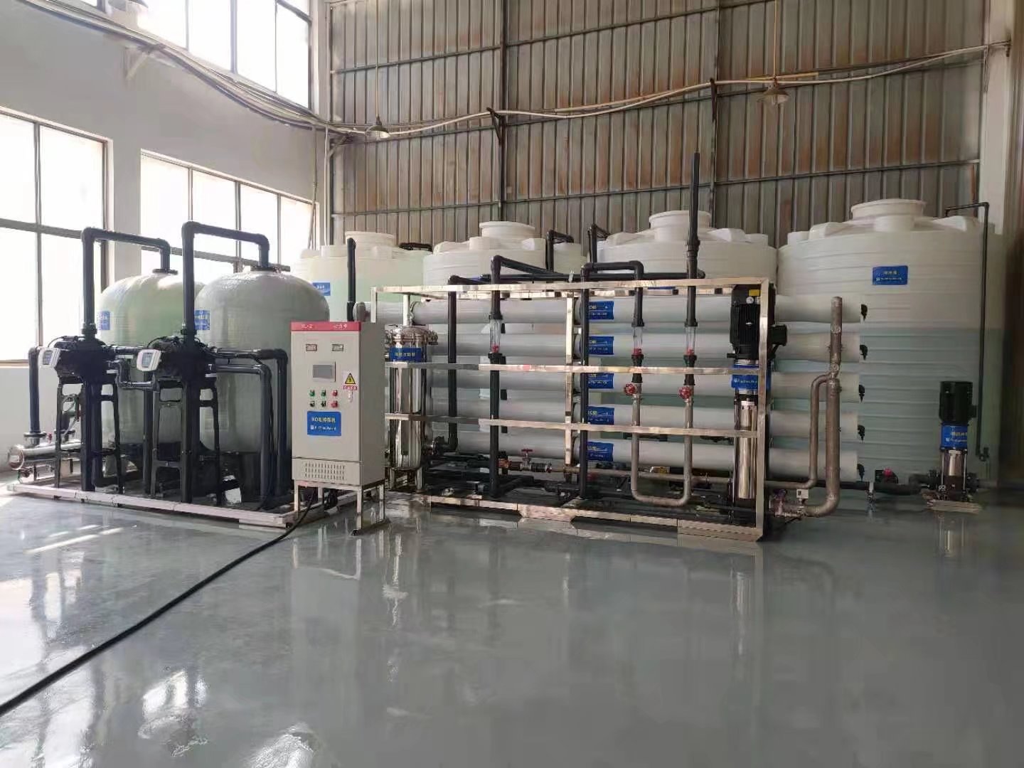 原水箱——原水泵——机械过滤器——活性炭过滤器——保安过滤器——高压泵—— 反渗透——纯水箱